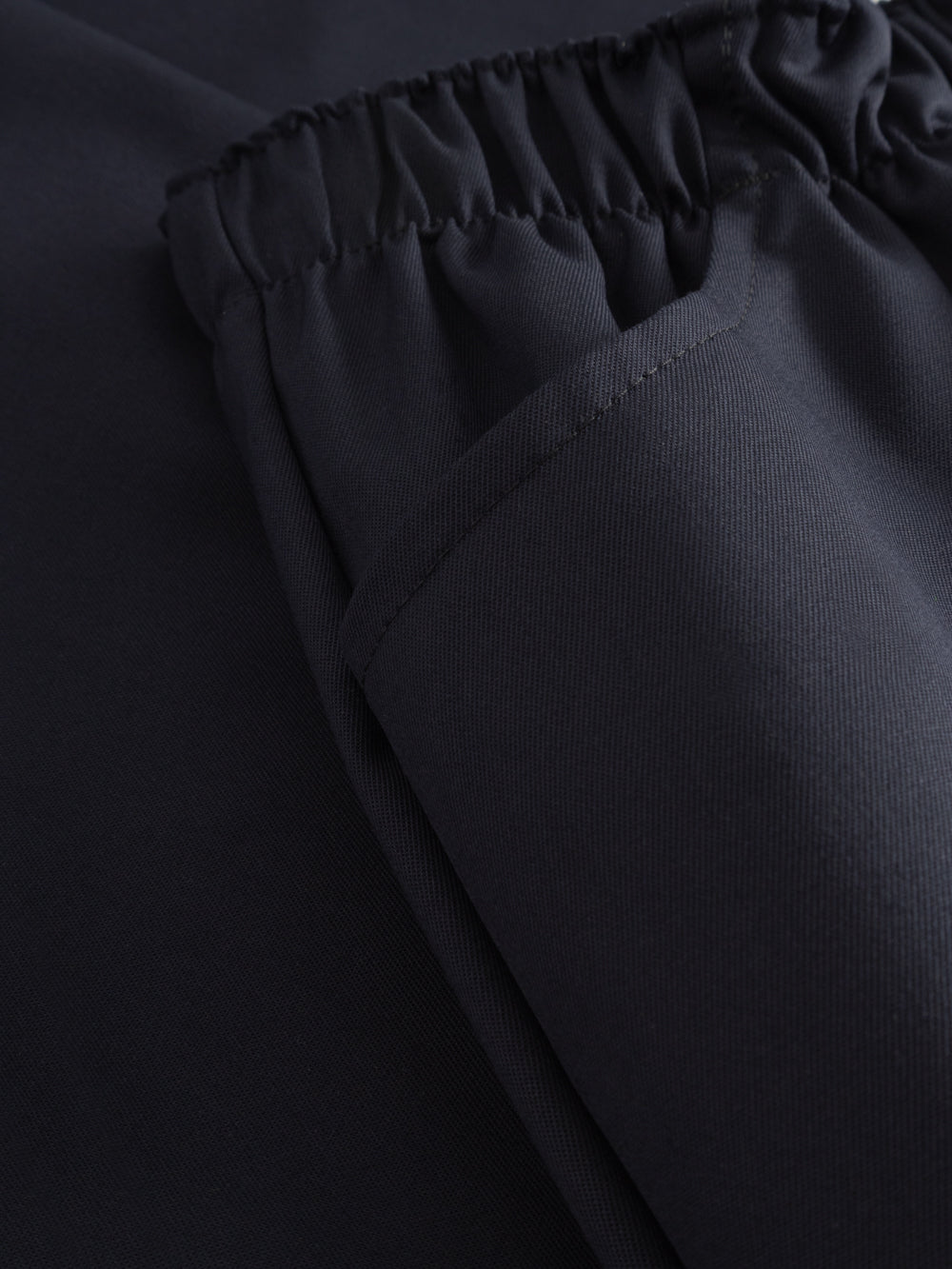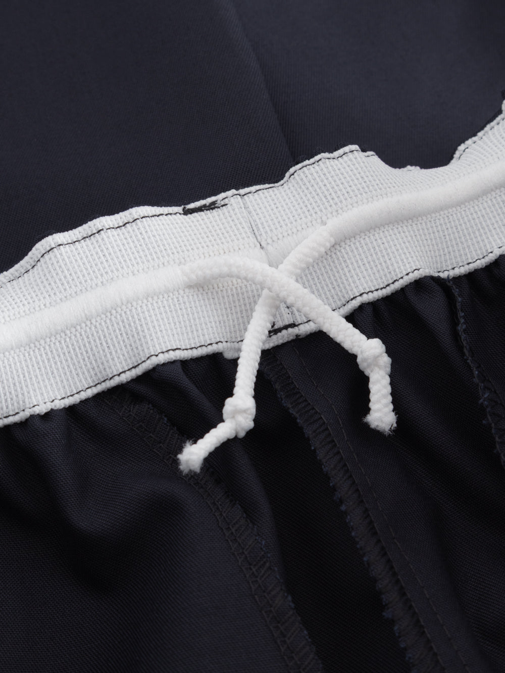 Yksityiskohtakuva tummansinisten housujen vyötäröllä olevasta kiristysnauhasta.