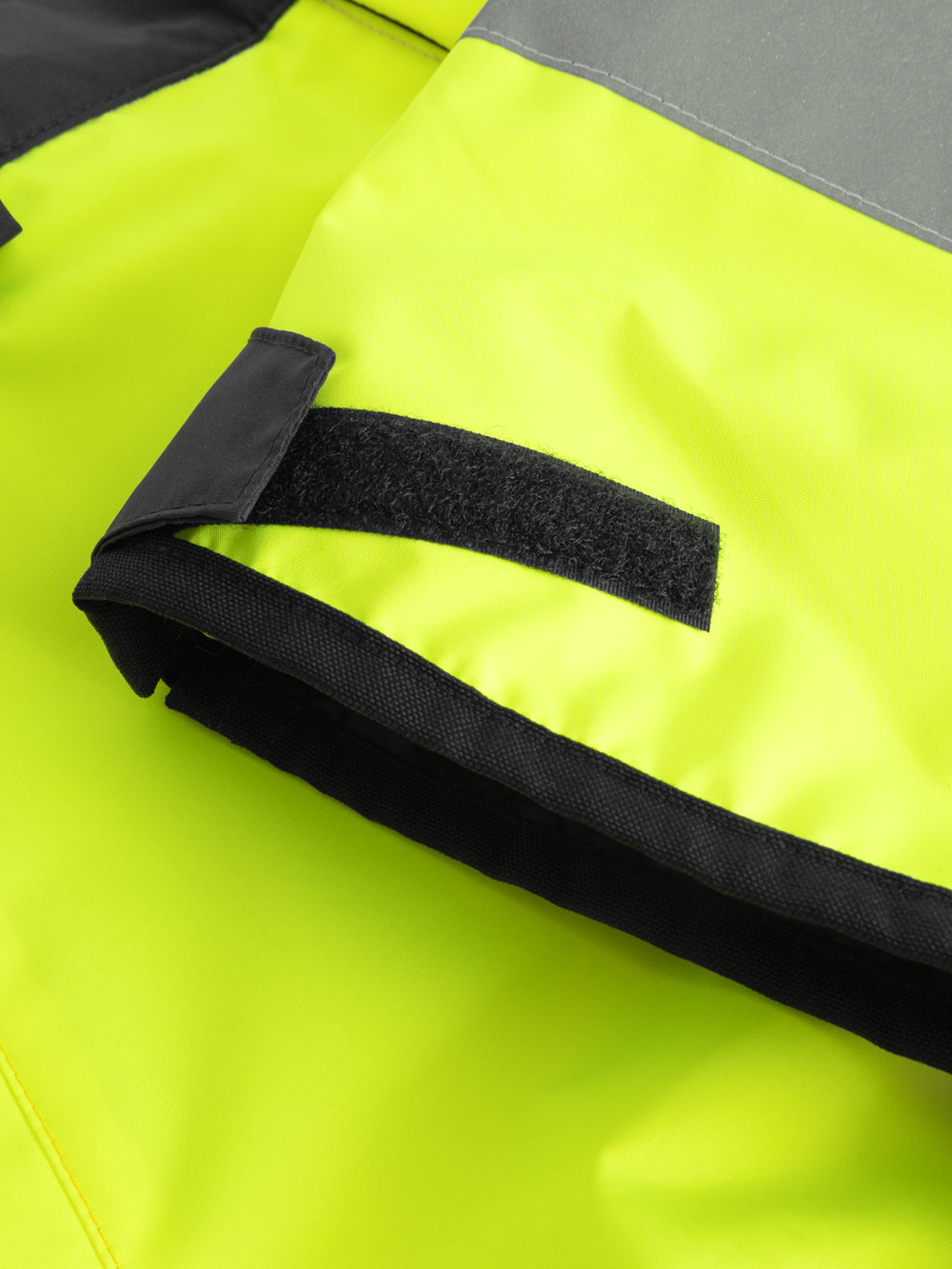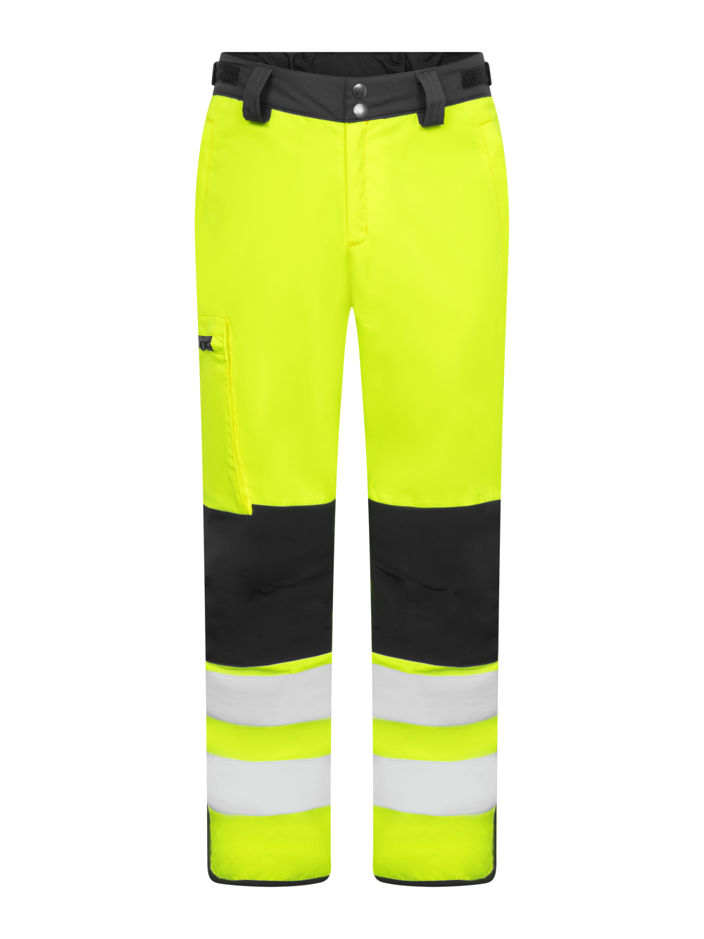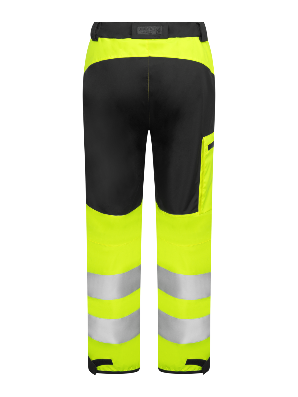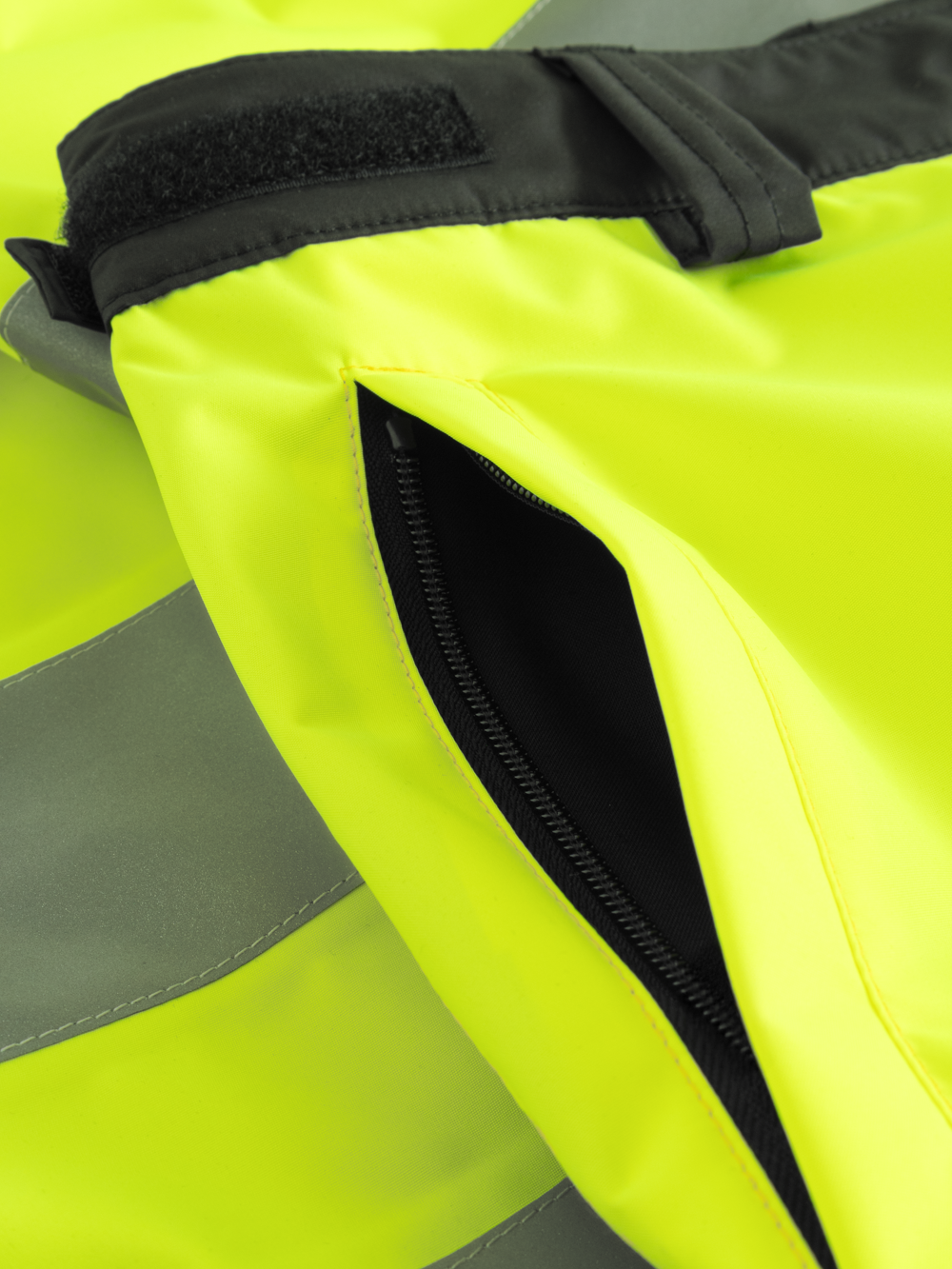 High-visibility shell trousers in women's sizes. The trousers have protective material and taped seams. The trousers have an adjustable elastic band and Velcro fastening at the waist. Pockets: zippered side pockets and a thigh pocket on the right leg. Shaped knee section, pocket for knee pads on the inside. Gift zippers under the protective strip, with Velcro fastening on the protective strip. Reflective details on the legs increase visibility. Cordura reinforcements at the leg opening. Loops on the inside of the waist for attaching suspenders. You can find the high-visibility shell jacket here. Standards: EN 343: 2019 lk3 EN ISO 20471: 2013 lk2