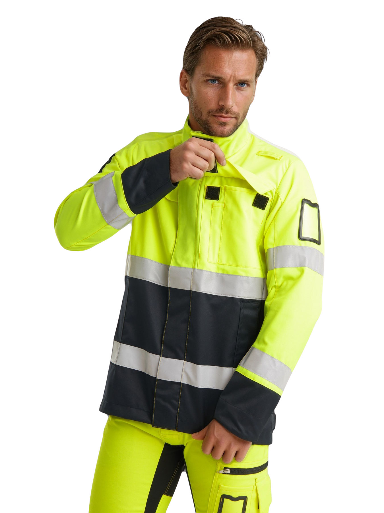 EN ISO 20471: 2013 class 2. High-visibility jacket for professional use on the construction site as well as for other tasks requiring visibility. The modern-sized jacket has plenty of pockets: two breast pockets with flaps and Velcro closure and two zippered pockets on the hips. The left breast pocket also has a pen holder. The sleeve also has an ID card pocket. The sleeves are designed to adapt to the shape of the arm.