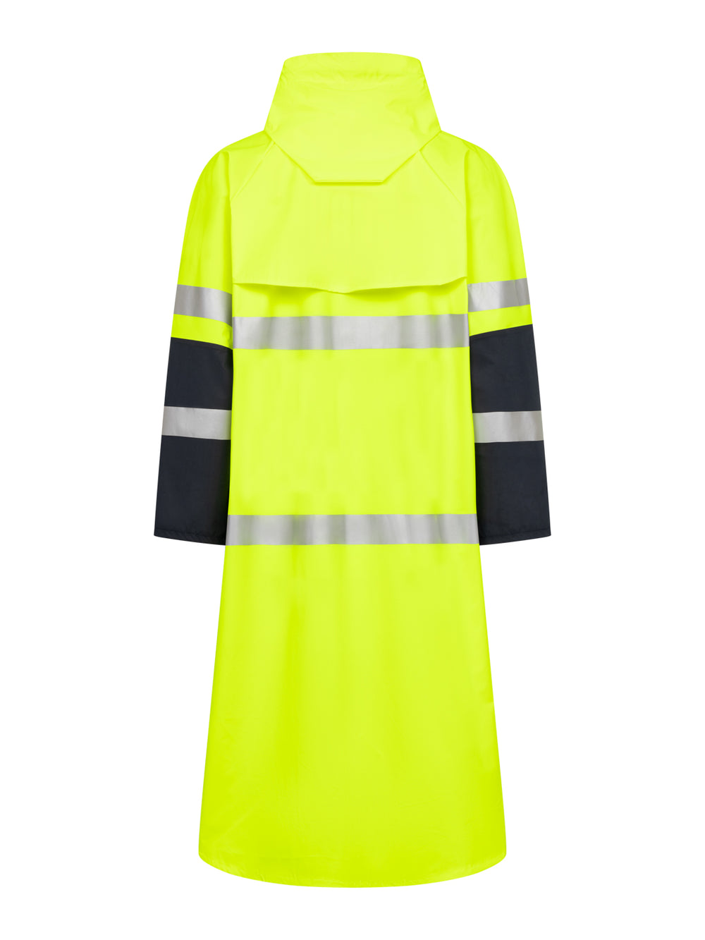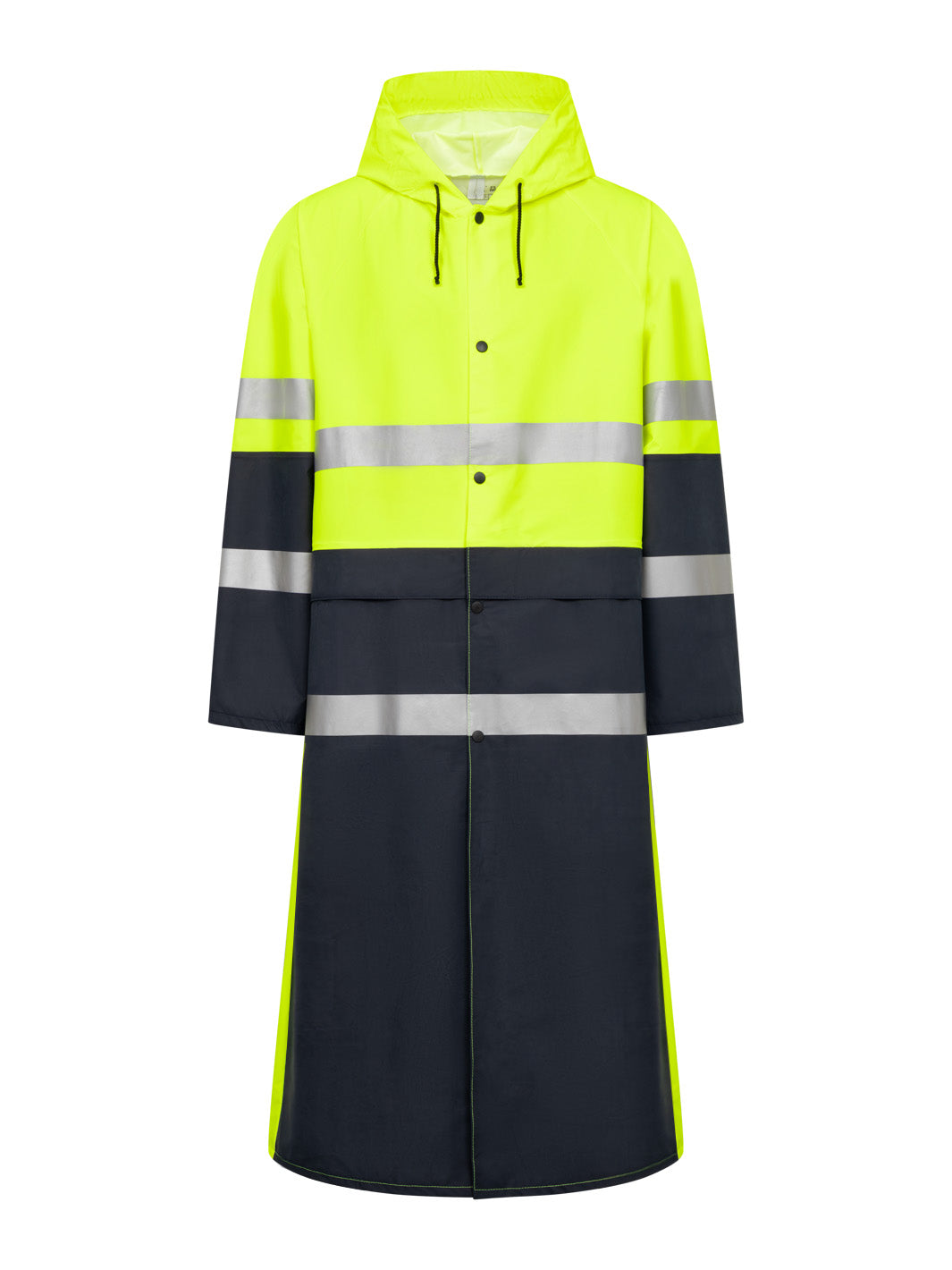 Standard EN ISO 20471 class 3 and EN 343. Rain jacket with a drawstring hood. Flexible and pleasant material. ID card pocket on the right side. This rain-proof high-visibility jacket has generous lower pockets with flaps and press fastening as well as a drawstring hood. Air vents on the back and underarms. Printed reflectors.