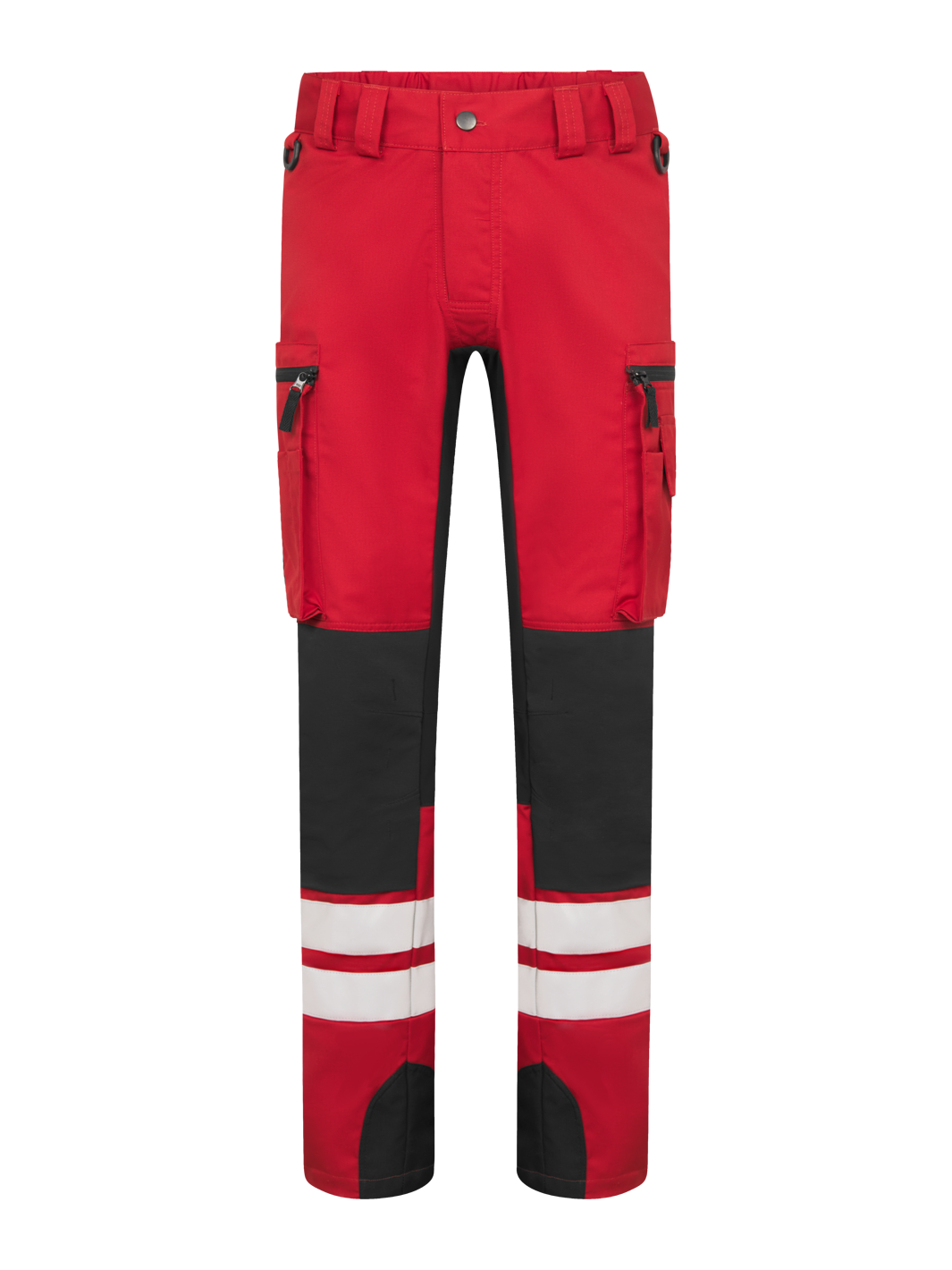 and large zippered thigh pockets with phone pockets on top. There is a convenient padding bag on the knee that can be filled from the outside. There are two reflective stripes on the legs for increased visibility.