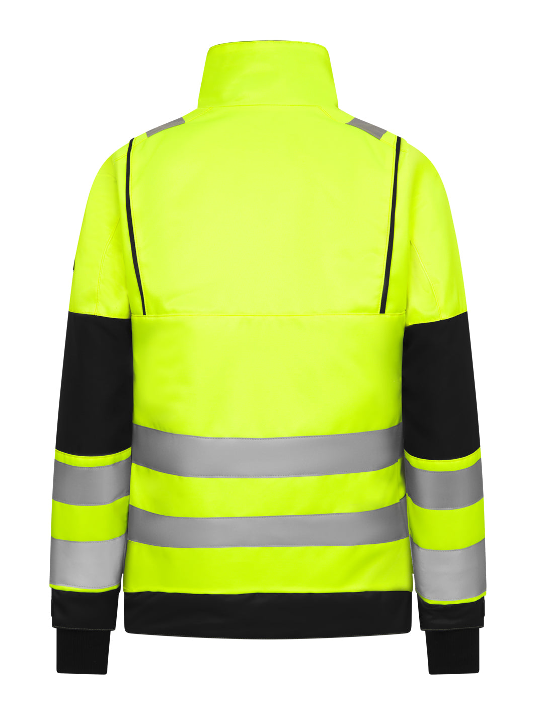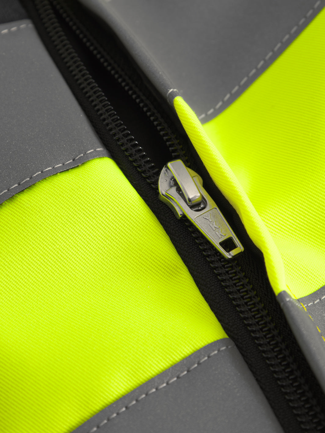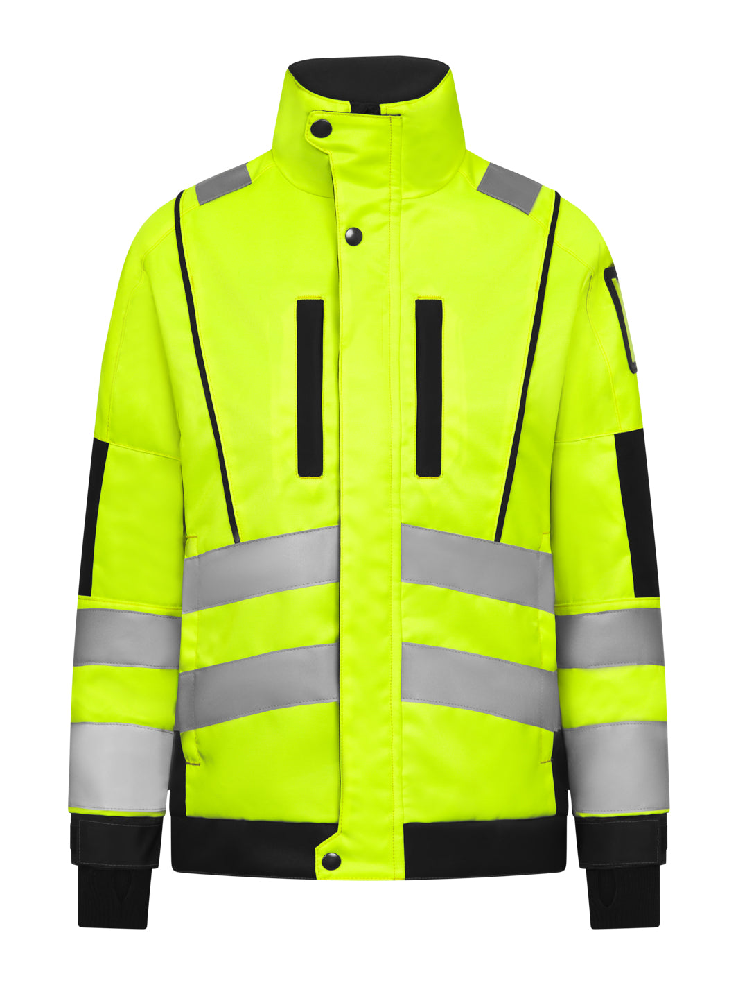 The attention-grabbing jacket has a cotton lining, a comfortable fleece collar and a snap-fastened wind protection strip on the front zipper. The Cordura reinforcements in the elbows extend the life of the garment. The jacket has handy pockets, such as zippered chest pockets and side pockets, in the left chest pocket there are openings for headphone connections. Threading loop for headphones in the collar. There is also a pen pocket on the inside of the front panel.