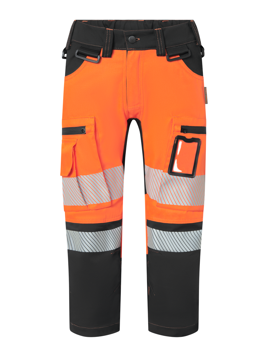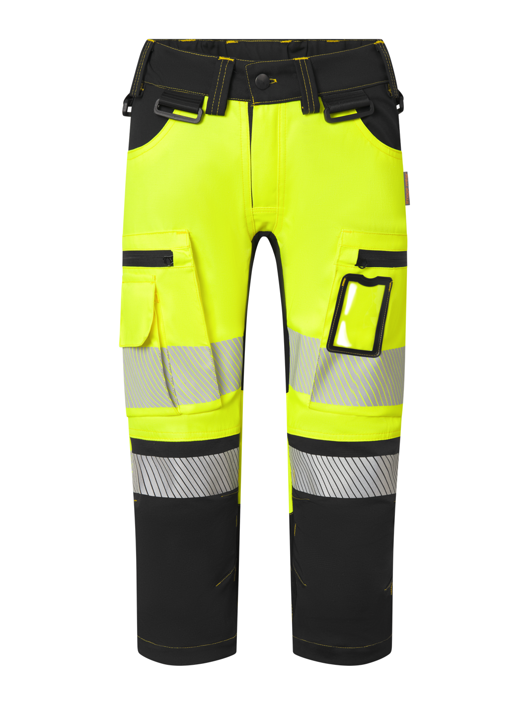 Standard EN ISO 20471 class 1. Women's stretchy high-visibility capris with breathable and durable stretch fabric at the crotch, inner thighs, knee bends and seat. Elastic waistband with belt loops and attachments for hanging pockets. Hanging pockets (96B96-456) available separately. Zippered thigh pockets on both thighs, with a pass pocket on the left and a phone pocket on the right. Cordura stretch fabric on the knees and pockets for knee pads. The legs are shorter at the back than at the front and elastic reflective prints on the legs.