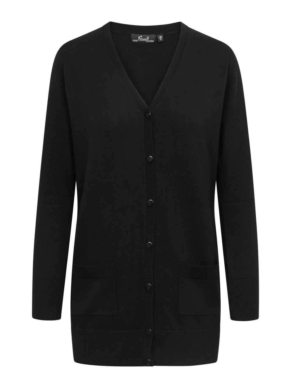 Women's classic longer cardigan. The cardigan has 7 buttons at the front, a v-neckline and elastic at the cuffs and hem. The material is a pleasant cotton-acrylic blend. The cardigan has lower pockets.