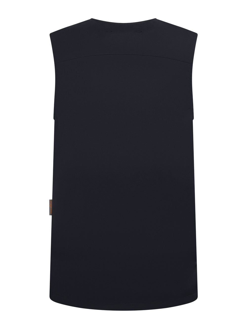 Tummansininen suora neppariliivi, unisex malli. Edessä nepparikiinnitys ja taskut. V-pääntie.