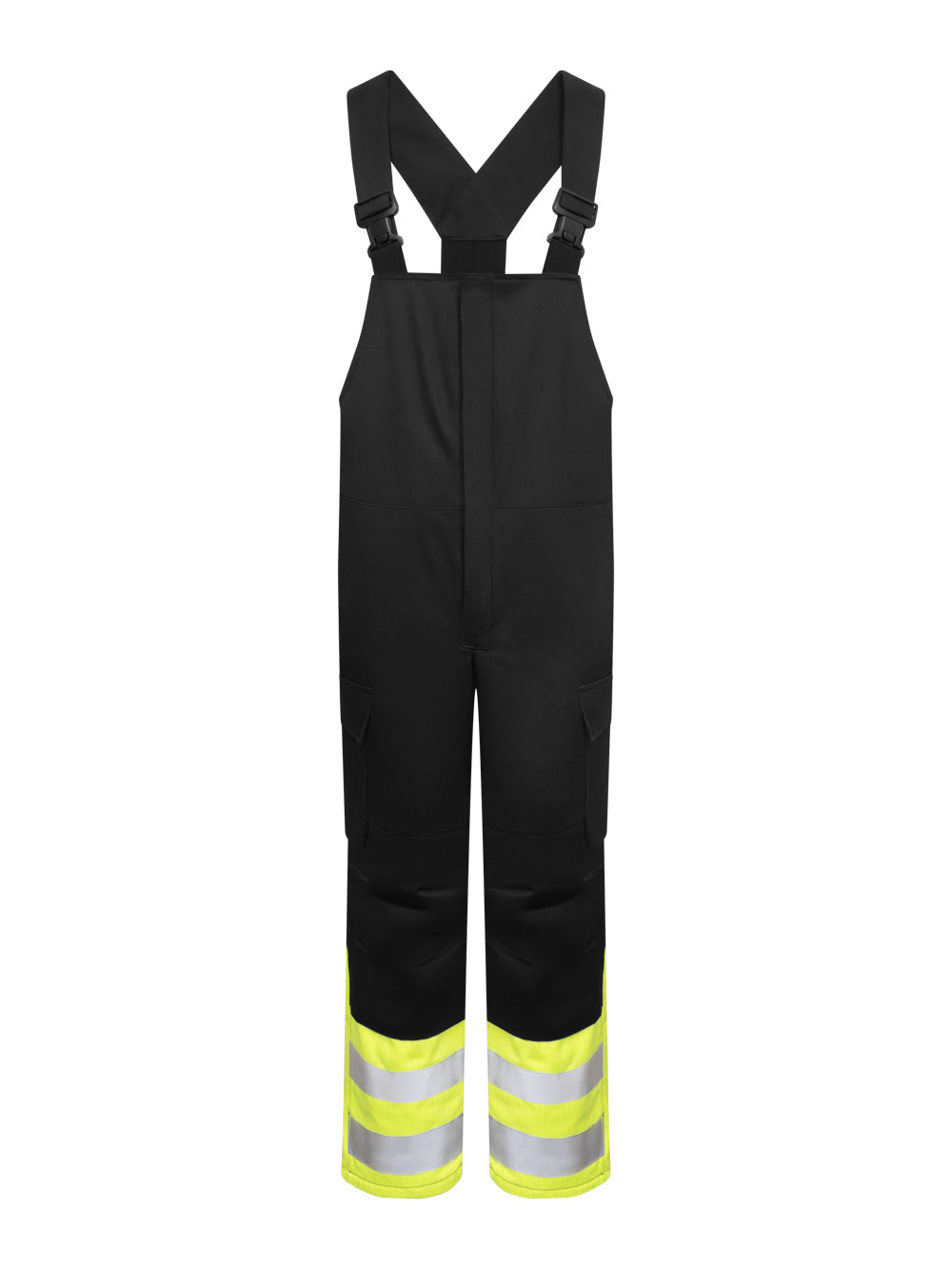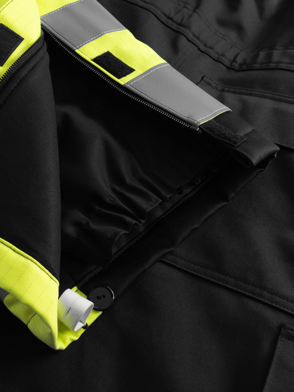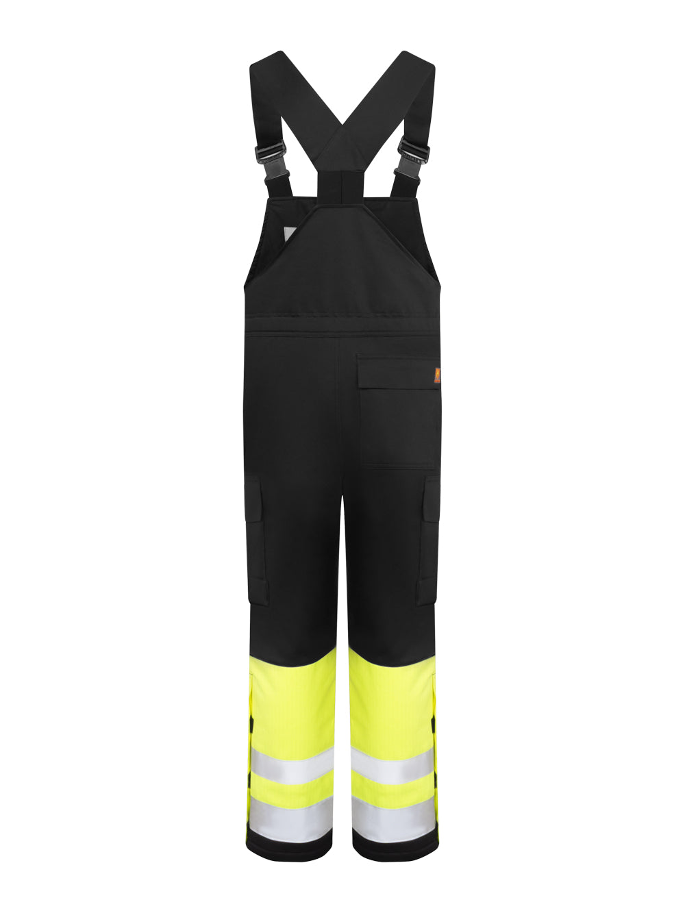 Etukuva palosuojatusta liivihaalarista. Lahkeet varoituskeltaiset ja lahkeissa 2 heijastinnauhaa, muuten haalarit mustat. Haalarin olkaimet ovat säädettävät.